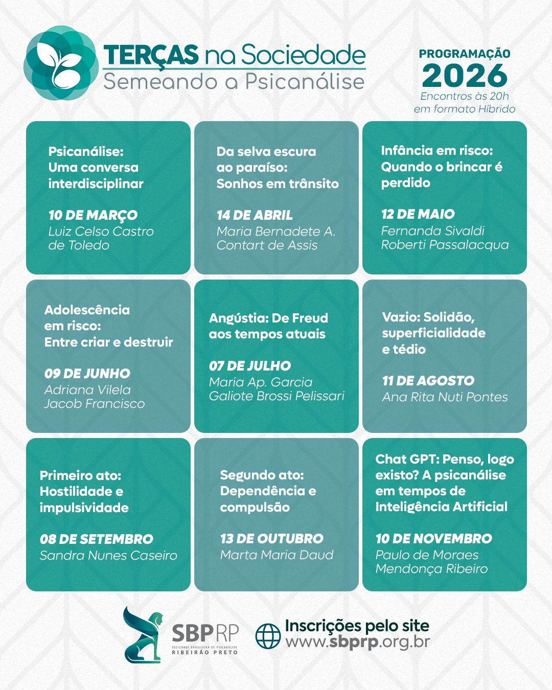 O Terças na Sociedade tem se consolidado como um espaço de interlocução da Sociedade Brasileira de Psicanálise de Ribeirão Preto (SBPRP) com a comunidade, tendo nas parcerias com universidades um importante meio de promoção desse trabalho.